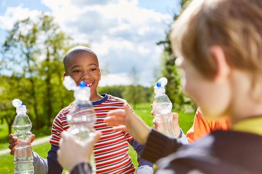 Diverse group of children holding recycling box with bottles