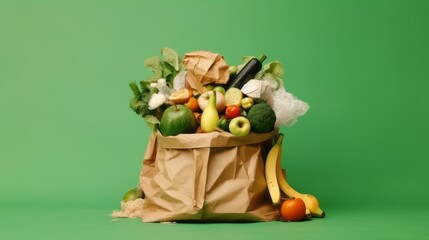 Sorted kitchen waste in eco-friendly paper bag on green background: compost container for sustainable lifestyle. Collection of vegetable and fruit peels and food scraps for recycling concept.
