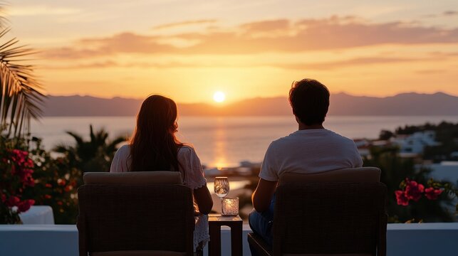 A romantic couple watching the sunset from a rooftop terrace overlooking the ocean