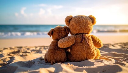Two adorable toy friends, a teddy bear and a dog, sit together on a sandy beach watching the golden sunset over the sea.