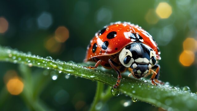 A close-up photo of a ladybug covered in water droplets on a grass blade during a rainfall