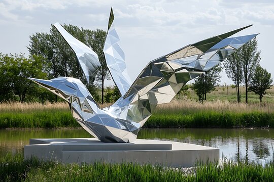 Modern bird sculpture by pond