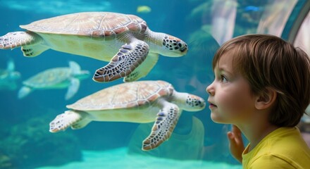 A young boy looking at a glass aquarium with three sea turtles swimming inside.