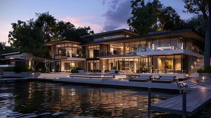 Evening gathering with fire pit waterfront lounge modern architecture serene atmosphere outdoor view relaxation concept