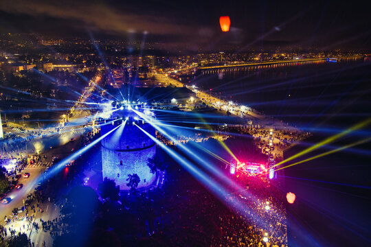 New Year’s Eve Gathering Around Thessaloniki White Tower with Festive Lights and Urban Energy