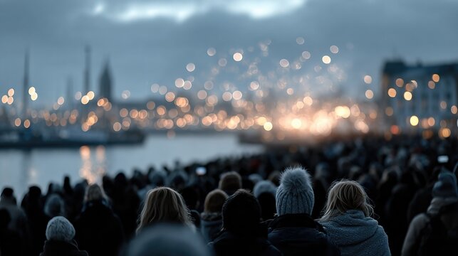 The image showcases a vibrant crowd lit by shimmering lights, embodying the energy and excitement of a waterfront celebration during twilight, filled with joy and community spirit.</description>