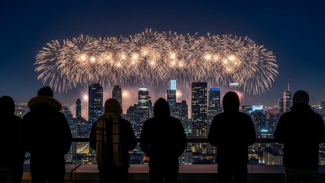 Silhouetted Spectators Greet a Grand Fireworks Display Over the City Skyline.