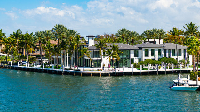 Summer vacation in tropical paradise resort. Luxury summer villa with yacht pier. Vacation in summer paradise. Luxury resort at summertime. Travel to tropical bay of Florida. Serene exotic landscape