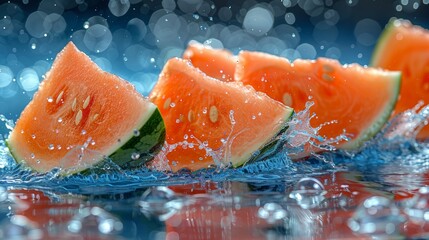 Fresh slices of watermelon flying on a blue background with exploding juice splash