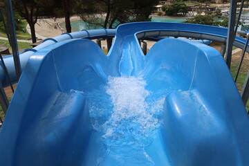 Blue Red Water Slide Amusement Park. Aquapark pipe. Water park aquapark slide spiral pipeline tunel