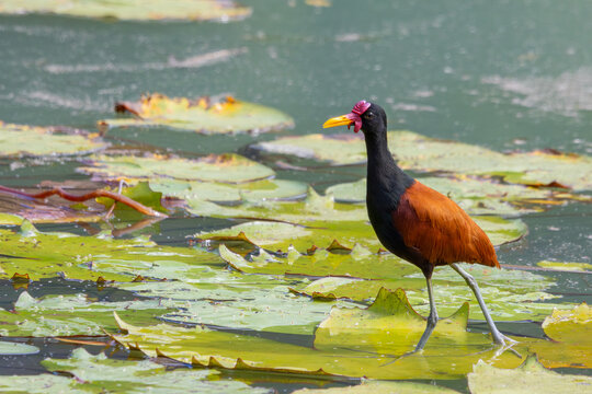Adult wattled jacana (Jacana jacana), on Queen Victoria water lily, Rio Pixaim, Mato Grosso, Pantanal