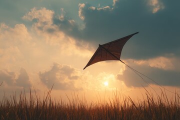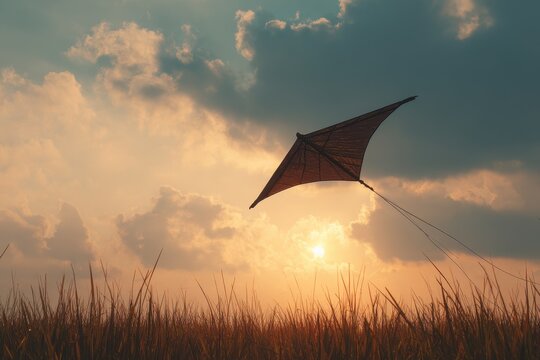 Silhouette of a Wau Bulan kite flying against a sunset sky