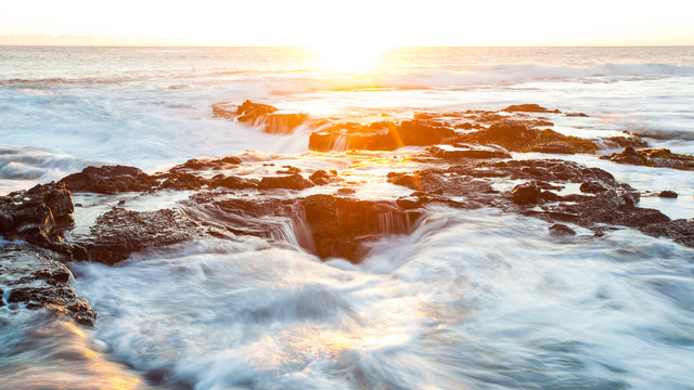 Stunning ocean sunrise with gentle waves and rocky shoreline