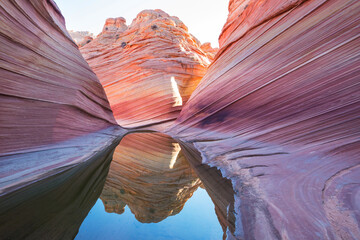 Circular sandstone aperture framing pastel sky over desert alcove with layered erosion