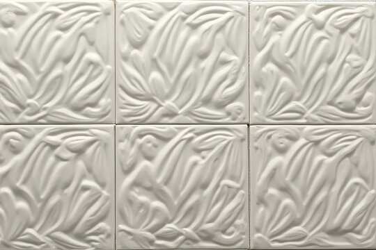 White ceramic tiles with raised 3D floral and wave like patterns arranged in a 2x3 grid