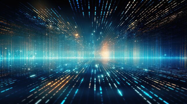 Creating an abstract futuristic background, flowing particles form a digital wave, blending shades of blue and orange in a dynamic display