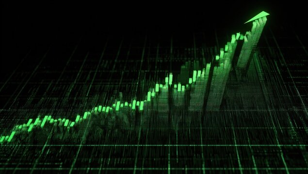 A digital representation of financial growth, a green rising bar chart, and an up arrow
