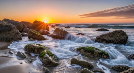 Scenic coastal panorama featuring ocean waves crashing against mossy rocks at sunset