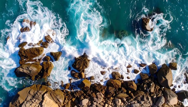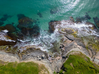Aerial top-down view of turquoise sea waves crashing over rocky coastline with moss and clear water. Wild nature texture along the Bulgarian coast, dramatic and scenic