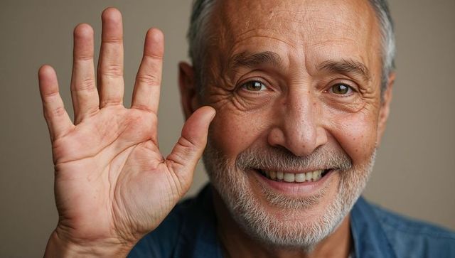 Smiling senior man waving hand in friendly headshot with raised palm and blue shirt