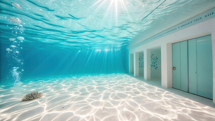Sunlight rays piercing through rippling water surface illuminating submerged white corridor with arched doors sandy bottom small coral and rising bubbles in vibrant turquoise aquatic environment