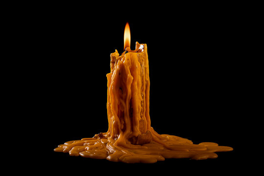 A single candle burning brightly with wax dripping down onto a wooden surface in a dim environment