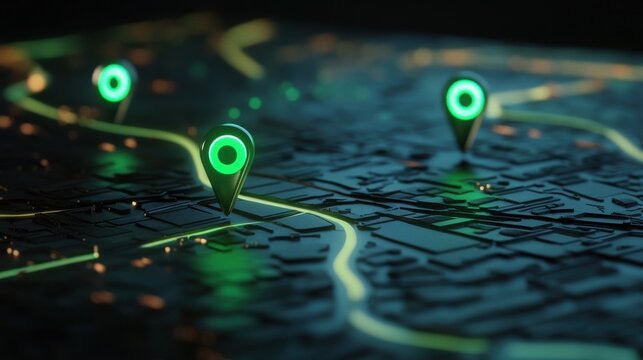 Map with location markers navigation route green and red pins urban layout city planning travel direction GPS technology road map digital mapping