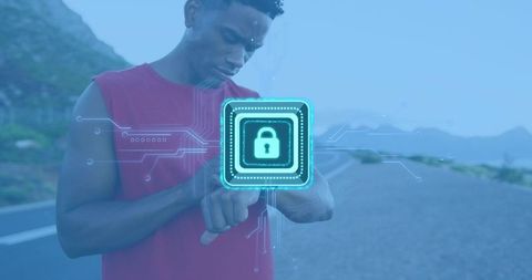 Male checking smartwatch with digital lock hologram representing wearable security on road