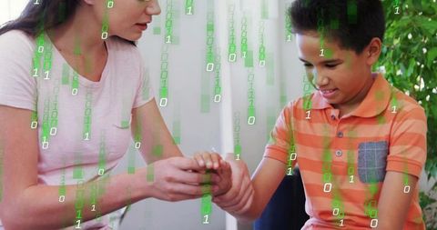 Caregiver checking child wearable while digital binary overlay showing health monitoring