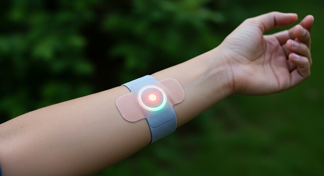A close-up of a wearable health monitor attached to a person's arm, featuring a small electronic device with a green light.