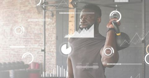 Male athlete lifting dumbbell while tracking performance with ar fitness analytics in gym