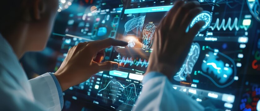 A doctor is monitoring continuous glucose data on a HUD hologram from a patients wearable device, close up, with a futuristic, cinematic style and copy space