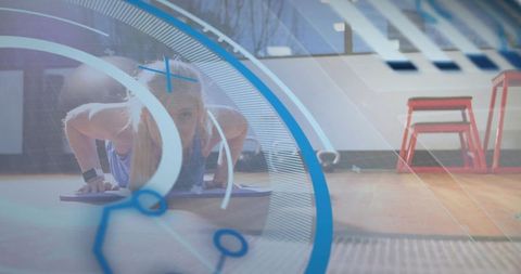 Blonde woman doing push-up with futuristic hud overlay in bright fitness studio
