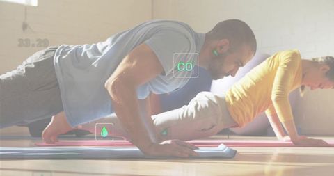 Male and female holding high plank in sunlit studio with wearable sensor overlays