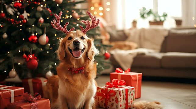 A dog wearing reindeer antlers sitting next to a Christmas tree with wrapped presents in a festive living room