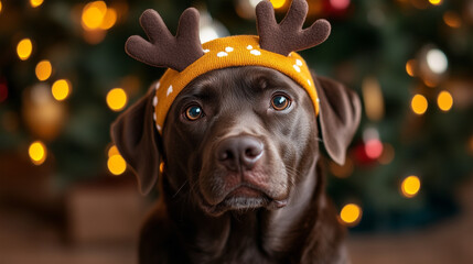 Retriever dog wearing reindeer antlers headband