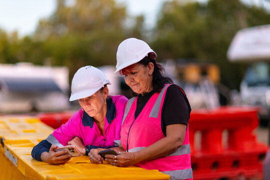 Women conversing while wearing pink ribbons for breast cancer awareness
