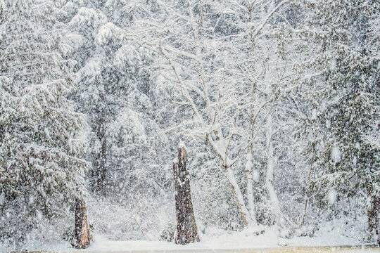 Snowfall blankets a forest, coating trees in a serene layer of white during a winter storm.