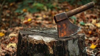 Rusty axe embedded in a decaying tree stump in an outdoor setting
