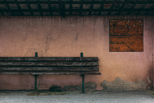 Old and abandoned bus station with weathered wall, old wooden bench and message board