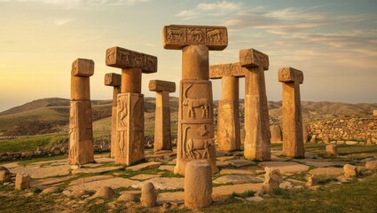 Close-up of weathered stone columns with intricate carvings.  Sunlight highlights the textures