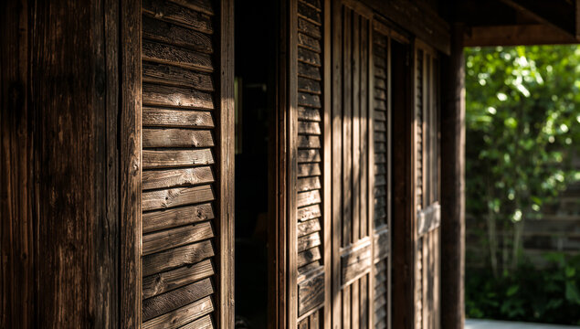 Rustic wooden shutters and weathered planks create a textured facade with dappled sunlight