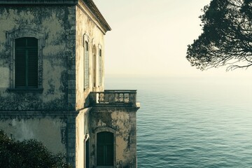 A weathered seaside villa with green shutters overlooks a calm sea, evoking serenity and a sense of timelessness.