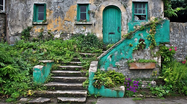 Overgrown stone steps leading to an old, weathered house with a teal door and windows.