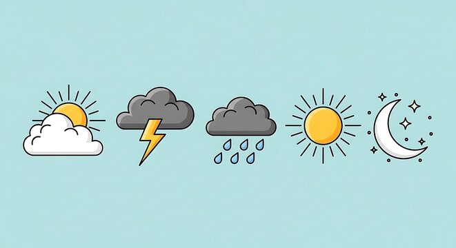 Weather Icons - Sunny, Stormy, Rainy, and Nightly Forecast Symbols.