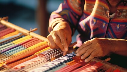 An elderly woman in a bright sweater weaving traditional textiles on a wooden loom, focus on hands and fabric.