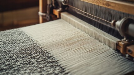 Skilled worker operating weaving machine in textile factory during daylight hours