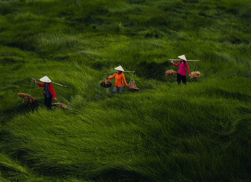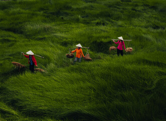 View of a farmer family harvests the grass, which is a raw material for weaving mats and many traditional items in Vietnam