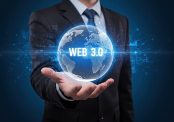 Web 3.0 concept businessman holding digital earth, modern technology solution