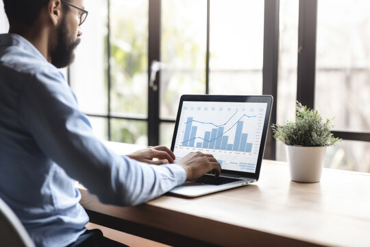 Portrait of male programmer or data specialist using computer in office with charts on screen, copy space